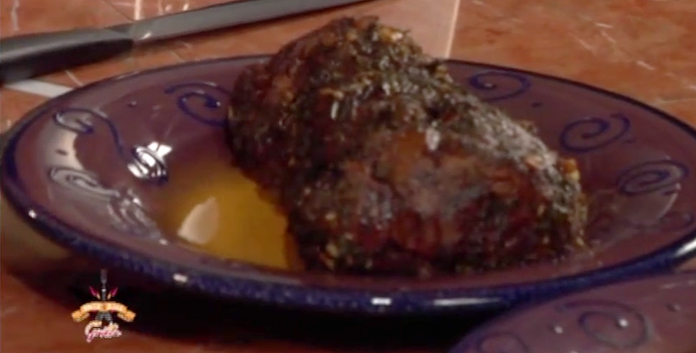- Tie with butcher string and roll in mixture of chopped garlic, sage, dill & thyme